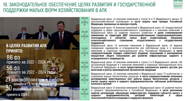 Что касается нашей законодательной работы, я должен сказать следующее и показать этот слайд. На этот год и в перспективе — десятки законопроектов, направленных на поддержку малого бизнеса, фермеров, в первую очередь. Эти проекты касаются укрепления правовых основ, кодификации, зелёной продукции (органической продукции), поддержки кооперативного движения, агрострахования и сохранения земель сельскохозяйственного назначения. Все эти законы, помимо нашей работы по государственным программам и бюджету, важны для развития отрасли.