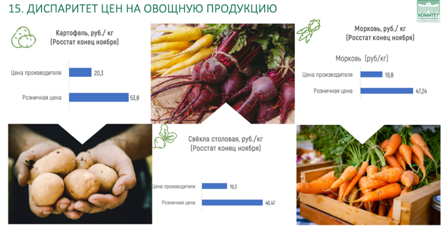 На примере картофеля видно, что, несмотря на стабильную отпускную цену в этом году (около 20 рублей за килограмм), на полках магазинов он продавался почти по 60 рублей. Это вызывает вопросы у потребителей. Аналогичная ситуация наблюдается с морковью, столовой свёклой и другими плодами.