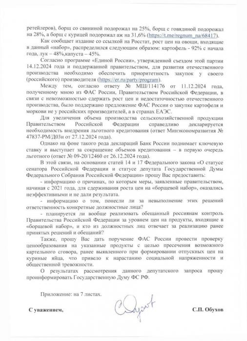 В рамках контрольных полномочий потребовал от правительства информацию о мерах, предпринимаемых им, в связи с резким повышением в торговых сетях цен на продукты, входящие в "борщевой набор";
