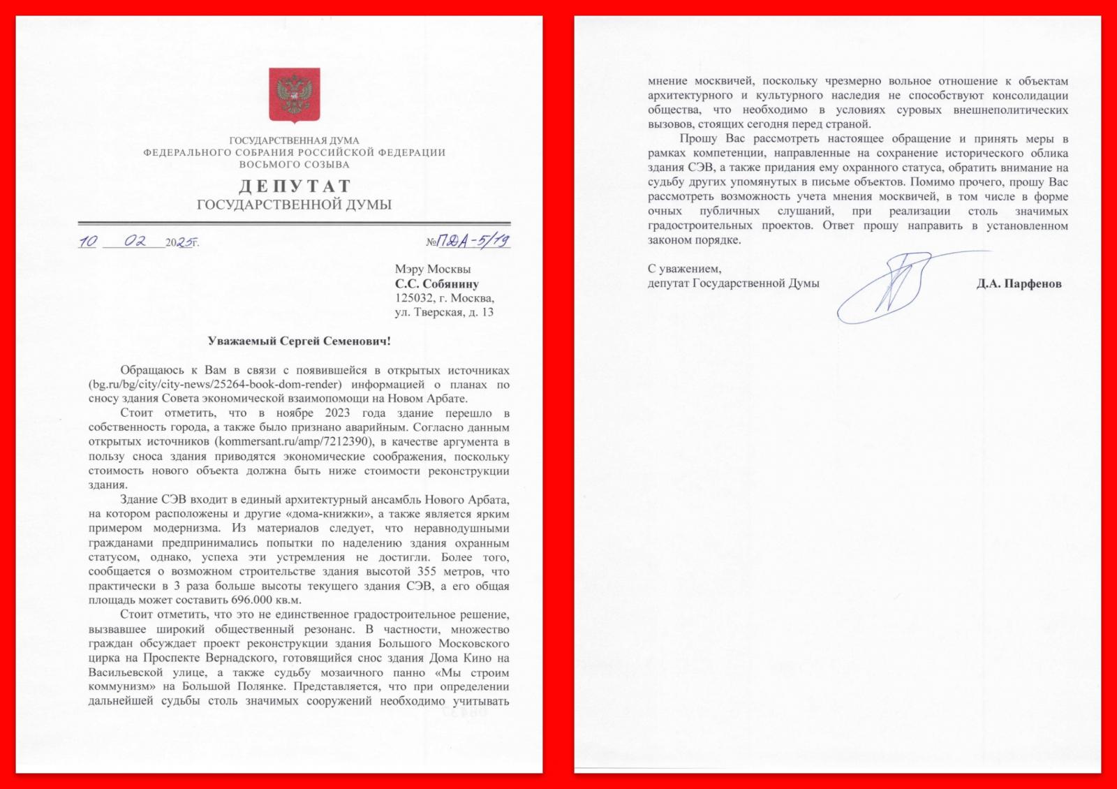 В связи со всплывшей информацией о возможных планах сноса здания СЭВ (Совета экономической взаимопомощи), входящего в единый архитектурный ансамбль Нового Арбата в центре столицы, а также о целом ряде совершенно абсурдных градостроительных решений, против которых совершенно справедливо выступают жители города: проекта реконструкции здания Большого Московского цирка на Проспекте Вернадского, готовящемся сносе здания Дома Кино на Васильевской улице, а также судьбе мозаичного панно «Мы строим коммунизм» на Большой Полянке, нападки на которое со стороны ряда чиновников идут уже долгие годы — депутат от КПРФ в Госдуме и секретарь МГК КПРФ Д.А. Парфенов направил на имя Сергея Собянина депутатский запрос.