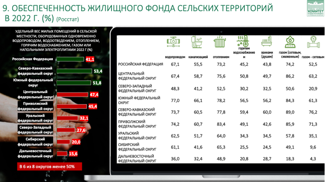 Из более чем шести тысяч приморских поселений в четырёх тысячах отсутствуют элементарные удобства: ни воды, ни канализации, ни надлежащей инфраструктуры. А теперь взглянем на газификацию: на Дальнем Востоке уровень подключения к сетевому газу — всего 4%, в Сибирском округе — 9%, в Северо-Западном — 20%. При этом страна обеспечивает газом многие страны, в том числе и враждебные, но собственное сельское население, наши кормильцы, вынуждены существовать в таких условиях. Разве это справедливо? Разве это не требует немедленного решения?