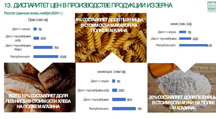 Особенно ярко это проявляется на примере хлеба. Сегодня труд крестьянина оценивается всего в 8–10% от стоимости батона. Производитель продаёт зерно в среднем по 12 рублей за килограмм. Из этого количества получается 2,5 батона хлеба, но уже на этапе переработки и торговли цена взлетает в несколько раз – мука отходит по 20–23 рубля за килограмм, а конечная стоимость хлеба на полке может превысить 100 рублей.