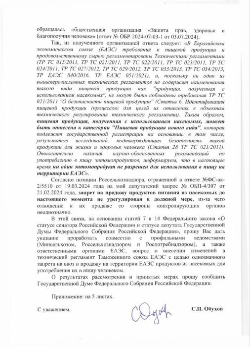 заявления от Правительства Российской Федерации о том, что его распоряжение №2761-р, легализующее муку из насекомых, не распространяется на продукты питания для людей;