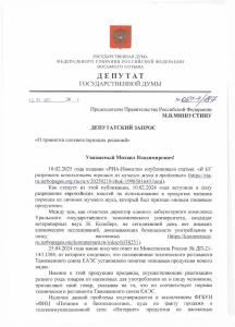 В связи с этим, направил в Правительство Российской Федерации депутатский запрос, в котором попросил: