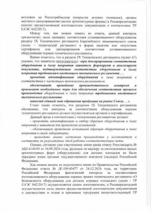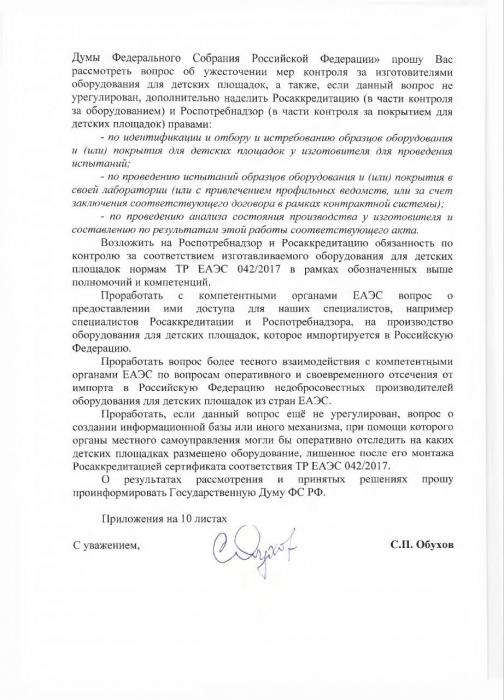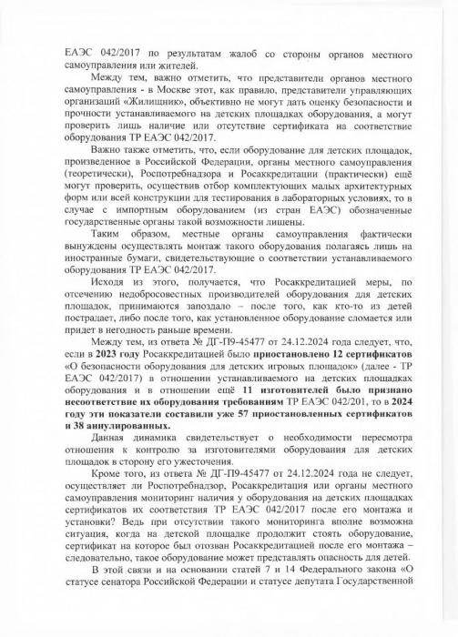 проработке со странами ЕАЭС более тесного взаимодействия с целью оперативного и своевременного отсечения от импорта в Россию недобросовестных производителей оборудования для детских площадок.