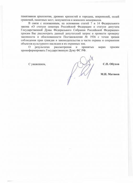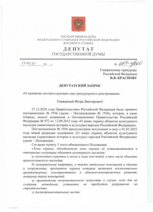 Депутаты Госдумы Сергей Обухов и Михаил Матвеев потребовали от генпрокуратуры провести правовую экспертизу постановления №1936, де-факто отменяющего охранные зоны объектов культурного наследия народов РФ