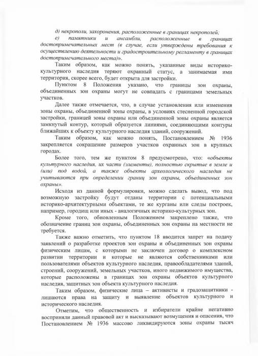 Одним махом ликвидирует зоны охраны тысяч памятников археологии, древних крепостей и городищ, некрополей, полей сражений, памятных мест, монументов и воинских мемориалов. Постановление просто ломает систему охраны культурных ландшафтов и исторических городов, существующую как минимум с 1940-х годов.