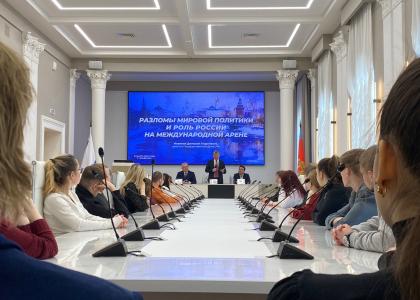 В своем приветственном слове Дмитрий Новиков рассказал студентам о своей работе в парламенте, сделав акцент на разности взглядов и мнений даже в Госдуме. Таким образом, депутат подводил к главной теме заседания — «Разломы мировой политики и роль России на международной арене». Они о том, что мир стремительно менялся последние 100 лет, и за это время произошло много рассказов о различных войнах, в том числе появилась такая концепция, как мировая война.