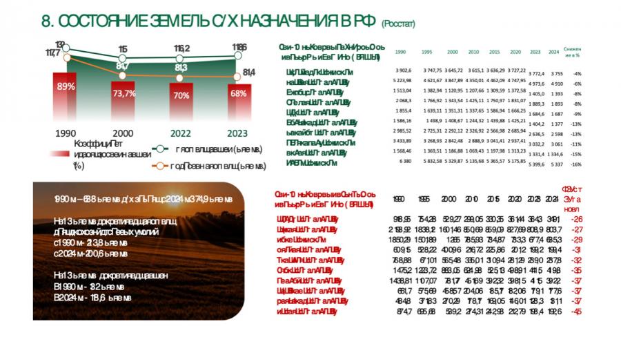 Особое внимание хочу обратить на вопрос земельных ресурсов, которые, казалось бы, находились в зоне ответственности профильных структур. Однако если трезво оценить ситуацию, мы увидим, что страна потеряла более трети сельскохозяйственных угодий. Сегодня речь идёт почти о 40% от тех земель, что были в нашем распоряжении в 1990 году.