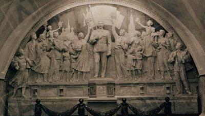 В переходе станции метро «Таганская» будет восстановлена архитектурная композиция с изображением Иосифа Сталина. Об этом сообщил Московский метрополитен. Работы уже начались, завершение ожидается в ближайшее время. Барельеф, посвящённый Победе в Великой Отечественной войне, будет воссоздан по архивным фотографиям и документам. Работы, по информации метрополитена, находятся на финальной стадии и завершатся «в ближайшее время».