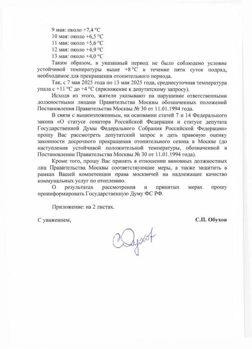 Сергей Обухов направил запрос прокурору Москвы М.С. Жуку с требованием проверить законность действий мэрии, установить нарушителей и защитить права москвичей на комфортные жилищные условия.