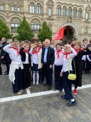 Депутат Госдумы (фракция КПРФ) С.М. Пантелеев от Санкт-Петербурга и Ленинградской области принял участие в торжественной линейке в честь Дня Пионерии на Красной площади и повязал пионерские галстуки.