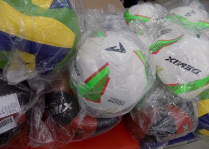Затем гости и ребята прошли на открытую спортивную площадку, где им вручили спортивный инвентарь: футбольные и волейбольные мячи, спортивную форму, гимнастические маты.
