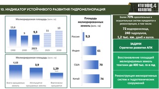 Важная тема в достижении поставленных задач это мелиорация, для понимания масштаба — в Соединённых Штатах Америки мелиорируемых площадей — 70 миллионов гектаров, в Китае — 74 миллиона орошаемых земель.
