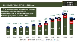 Теперь — о бюджете. На первый взгляд — вроде бы есть повод для оптимизма. Бюджет в последние годы растёт, цифры внушительные, формально можно даже порадоваться. Но если мы посмотрим глубже, то сельское хозяйство — это всего лишь 1,3% от расходной части федерального бюджета.