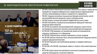 Несколько слов о законотворческой работе, мы тоже стремимся вместе с Вами убрать завалы АПК в правовом поле, уже принято 102 закона выстроившие вертикаль управления во всех отраслях АПК. Земельные отношения, ветеринарное и фитосанитарное благополучие, законы о семеноводстве, о зерне, племенном животноводстве, органической продукции, цифровизации, налоговые, бюджетные и многие другие это наш отчет, если за 6 Государственную думу было принято 15 федеральных закона, то на слайде вы видите цифру 102 и главное все они сутевые. Нельзя не отметить, что мы провели итоговые коллегии на высоком уровне по Россельхознадзору и Росрыболовству.