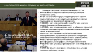 Мы не просто обсуждаем проблемы. Мы принимаем решения, оформляем их в закон и доводим до реализации на местах. В рамках весенней сессии в работе у нас 42 законопроекта — каждый из которых направлен на то, чтобы конкретно помочь нашему крестьянину, фермеру, работнику водной нивы, переработчику, кооператору, среди которых: улучшение выплат кооперативам, контроль цен на социально значимые продукты, поддержка переработчиков через обучение, снижение налогов для овощепереработчиков и так далее и так далее.