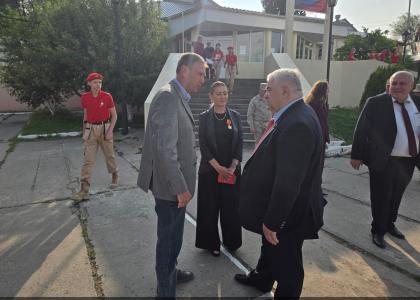 Казбек Тайсаев передал слова приветствия от Председателя ЦК КПРФ Г.А. Зюганова, Председателя Государственной Думы РФ В.В. Володина, вручил командиру военной базы А.В. Безбородову, благодарность и памятную медаль "80-лет Великой Победы".