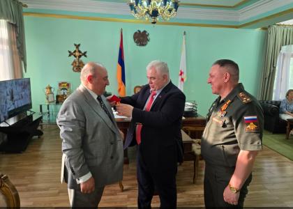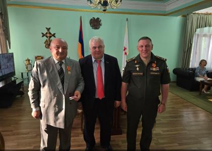 В теплой, дружественной обстановке прошла встреча Казбека Куцуковича Тайсаева и Романа Николаевича Голубицкого. К.К. Тайсаев передал слова приветствия от Председателя ЦК КПРФ, руководителя фракции КПРФ в Госдуме ФС РФ Г.А Зюганова, Председателя Государственной Думы РФ В.В. Володина, наградил Р.Н. Голубицкого памятной медалью «80 лет Великой Победы». Казбек Тайсаев поблагодарил Романа Николаевича и личный состав за помощь в проведении ряда совместных мероприятий на территории Армении, а также за масштабное проведение мероприятии, посвященное памятной дате – 80 лет Победы и вручил благодарность «За высокий профессионализм, активное участие и проведение мероприятий в честь празднования 80-летия Великой Победы. За ратный труд и большой вклад в дело обеспечения государственной безопасности».