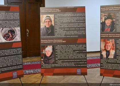 Экспозиция представляет собой стенды с фотографиями очевидцев и их рассказами о преступлениях ВСУ. Всего 20 историй, которые вошли в книгу Максима Григорьева и Дмитрия Саблина "Военные преступления киевского режима. Материалы Международного общественного трибунала по преступлениям украинских неонацистов 2023-2024 годов". В издании представлены свидетельства пострадавших от Вооруженных сил Украины. Эти факты являются доказательствами военных преступлений, которые не имеют срока давности.