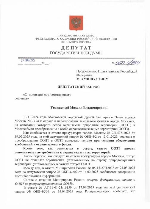 Учитывая около 2,5 тыс. подписей, полученных мною от вас - моих избирателей. Мною был направлен депутатский запрос премьер-министру Михаилу Мишустину, в котором я поддержал идею о проведении совещания с участием всех природоохранных ведомств и признании охранных статусов ООЗТ аналогичным статусам ООПТ.