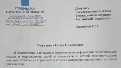 Получила ответ от Губернатора Саратовской области на мой депутатский запрос о летней оздоровительной кампании для детей.