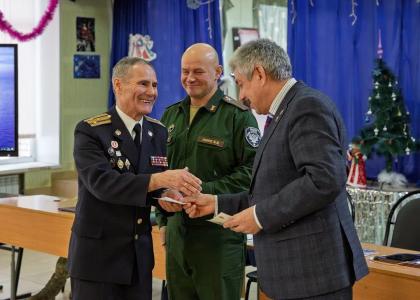 Директор училища казачий полковник Пинте В. В. поприветствовал участников встречи и огласил тему: «Служение Отечеству на примере героических биографий легендарных Героев Отчизны».