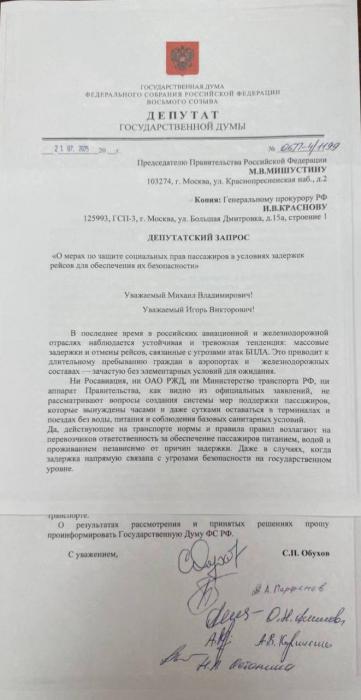 Очевидно, что транспортные сбои будут нарастать: вопросы безопасности - это приоритет. Но безалаберность чиновников и траспортников в связи с ростом транспортных сбоев очевидно ведет к росту социальной напряжённости. Группа депутатов Госдумы от КПРФ Сергей Обухов, Нина Останина, Денис Перфенов, Ольга Алимова, Алексей Корниенко направил официальный депутатский запрос премьер-министру Михаилу Мишустину и Генпрокурору Игорю Краснову. Речь идёт о срочной необходимости: