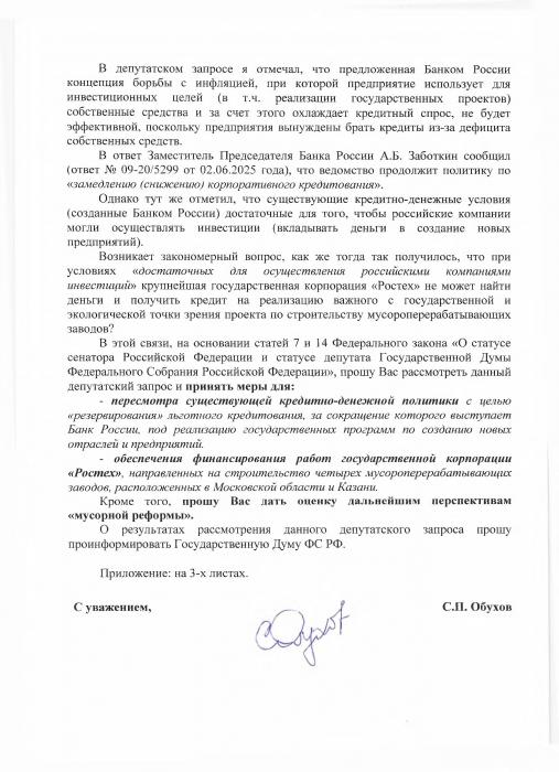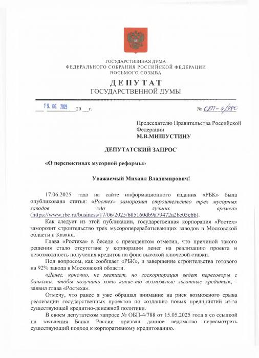 В середине июня депутат Госдумы РФ Сергей Обухов направил в адрес руководителей Правительства РФ и Центробанка депутатские запросы, в которых поинтересовался, почему, при всех декларациях о развитии «зелёной экономики» и строительстве мусороперерабатывающих заводов, «Ростех», в реальности, «замораживает» стройки, а мусор продолжает гнить на полигонах?