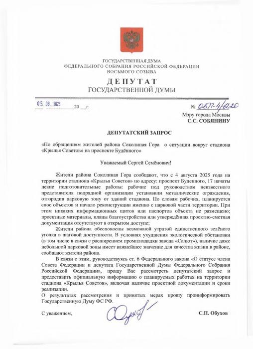 Самый «свежий» из них ушел за его подписью буквально 5 августа – в адрес мэра столицы. В нем депутат Госдумы Обухов проинформировал градоначальника о нынешней ситуации вокруг «несчастного» стадиона. Жители района Соколиная Гора сообщают, что 4 августа на территории стадиона «Крылья Советов» начались некие подготовительные работы: рабочие, под руководством неизвестного представителя подрядной организации, установили металлические ограждения, отгородив парковую зону от зданий стадиона. По словам рабочих, планируется снос объектов и начало реконструкции именно с парковой части территории. При этом никаких информационных щитов или паспортов объекта не размещено. А проектные материалы, планы благоустройства или утверждённая проектно-сметная документация в открытом доступе отсутствуют. Поэтому жители района весьма обеспокоены возможной утратой единственного зелёного уголка в шаговой доступности. Потому что в условиях ухудшения экологической обстановки, с учетом расширения промплощадки завода «Салют», наличие даже небольшой парковой зоны имеет важнейшее значение для качества жизни в районе.