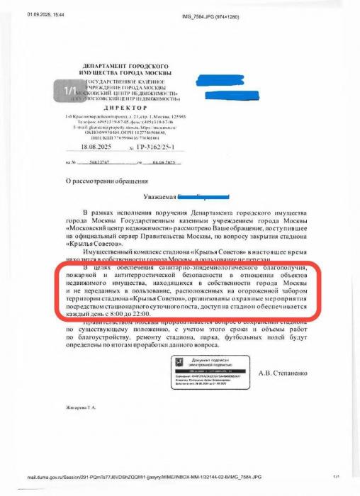 Как мы видим, ограничения на допуск не были сняты несмотря на письмо с уведомлением от ДГИ, предписывающее лицам, осуществляющим охранные мероприятия, обеспечить свободный ежедневный доступ на стадион с 8:00-22:00.