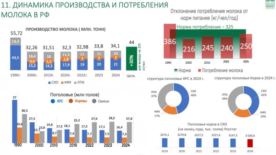 Мы декларируем производство в размере 34 миллионов тонн молока, из них 21 миллион тонн дают крупные хозяйства и около 10 миллионов тонн — личные подсобные хозяйства. Но если посмотреть правде в глаза, то в реальности в ЛПХ — дай Бог, если 3,5 миллиона тонн. Цифры искажаются, и это серьёзная проблема.