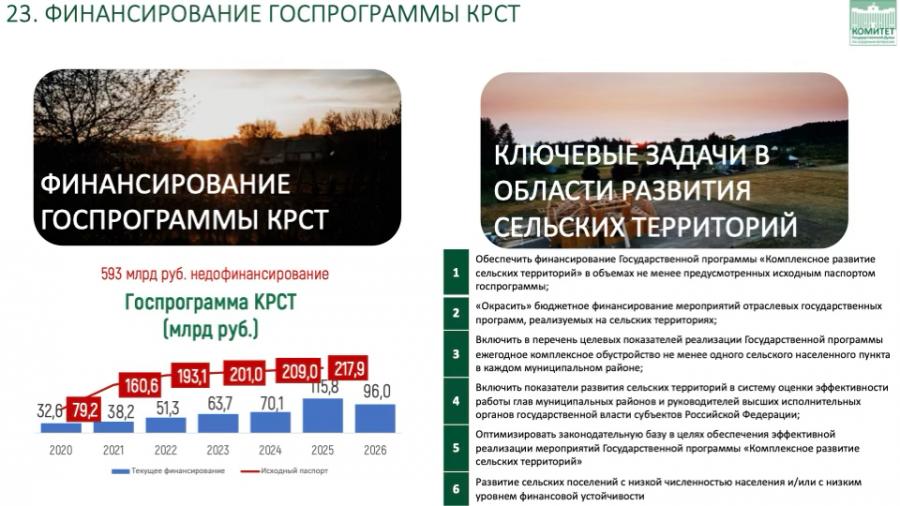 Сегодня мы не имеем права сбрасывать со счетов ещё одну важнейшую тему — развитие сельских территорий. Эта программа вошла в стратегический комплекс развития села, и ещё в период, когда министром был Александр Ткачёв, мы её активно отстаивали. На пленарном заседании, где я делал соответствующий доклад, её поддержали все руководители фракций. В итоге программа была утверждена и действует.