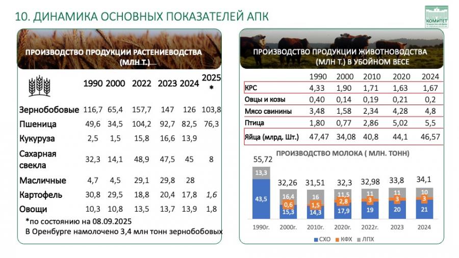 Да, друзья, легко было в своё время сократить поголовье скота в пять раз — возьмём тот же Оренбург. Конечно, мы научились наращивать продуктивность, и это радует. Но факт остаётся фактом: молока мы производим сегодня в два раза меньше. Да, технологии другие, подходы меняются, появляются современные фермы. Вот недавно Андрей Анатольевич ввёл в строй новую ферму — министр сельского хозяйства О.Н. Лут приезжала. Современные технологии позволяют получать по 9–10 тысяч литров молока на корову, и это внушает оптимизм. Но двигаться в этом направлении нужно всем вместе, без исключения. Не игнорируя личное подсобное хозяйство, семейные фермы, фермерские хозяйства.