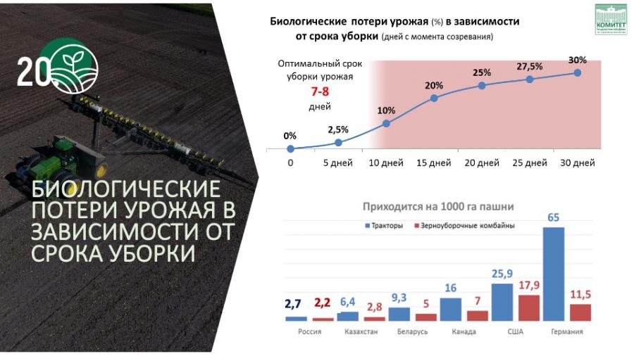 Посмотрим по России: на тысячу гектаров приходится 157 лошадиных сил техники, в то время как в Белоруссии — 700. Мы имеем 2 комбайна на тысячу гектаров, а в США — 18. Разве они дураки держать такую мощность? Нет! Они понимают простую науку: если урожай пшеницы созрел, то каждый день промедления после полной спелости стоит 1% урожая.