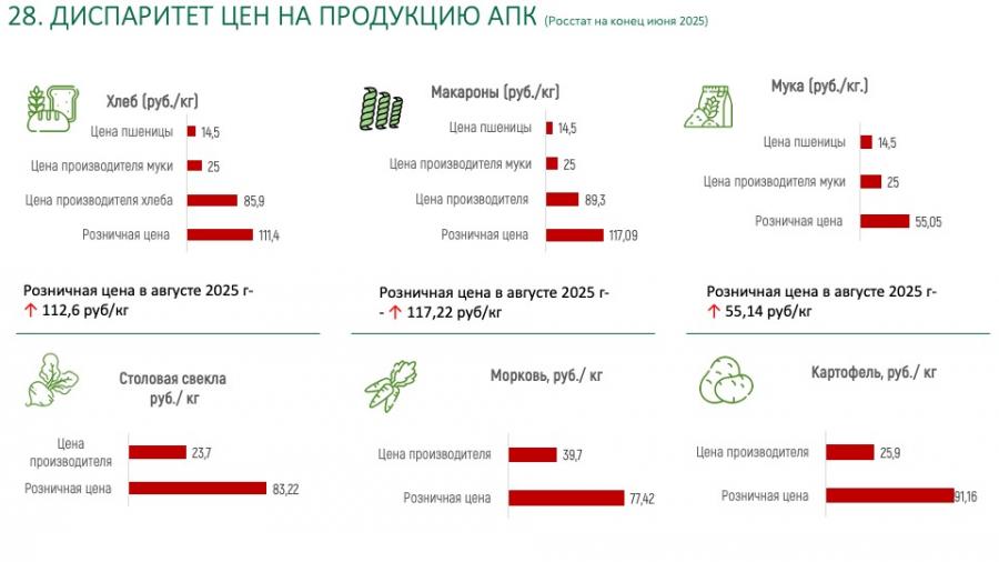 Сегодня мы видим вопиющий пример диспаритета цен. Мука с завода продаётся по 25 рублей, а на полке в магазине она стоит уже 55 рублей. Разброс колоссальный, наценки необоснованные. В результате — крестьянин, производитель, оказывается в самом низу цепочки, получая копейки, тогда как торговля забирает основную прибыль.