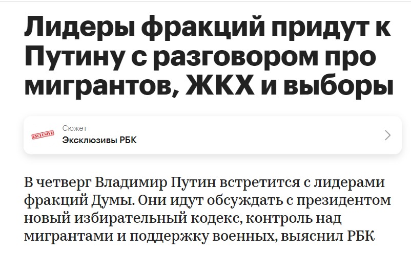 На встрече с президентом Владимиром Путиным сегодня лидеры думских фракций планируют обсудить бюджет, выборы, ЖКХ, военную операцию. Конечно, что будет в «папочке» у каждого лидера фракции до поры до времени останется непубличным, но в принципе во время пленарной сессии в Госдуме все они уже выступили с политическими заявлениями, и общие контуры проблематики от каждой партии - уже понятны. И наверняка на встрече у президента лидеры партий и фракций продолжат полемику по итогам выборов, начатую в Думе.