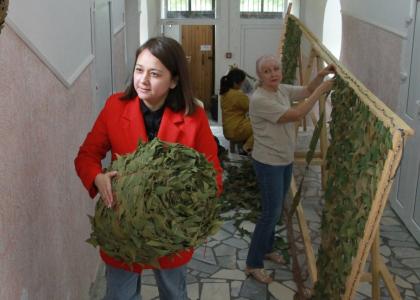Регина Юхневич уже два года курирует точку плетения маскировочных сетей в Тобольске. Работа там не прекращалась ни на день: зимой волонтёры изготавливали противодроновые одеяла, а сейчас возобновляют производство окопных свечей. Также активно шьются специальные подушки-косточки для раненых бойцов.