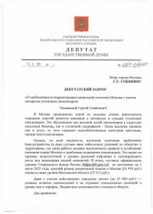 Депутат Государственной Думы от фракции КПРФ Сергей Обухов направил мэру столицы Сергею Собянину депутатский запрос о необходимости корректировки социальной политики Москвы с учётом интересов пенсионеров.