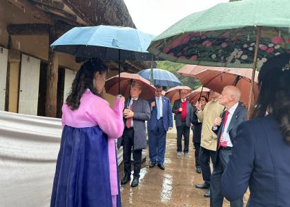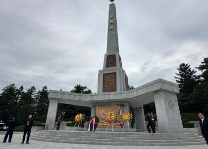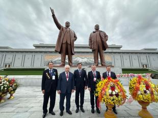 Затем делегация посетила Музей корейской революции, где представлена история революционной деятельности Великого Вождя товарища Ким Ир Сена и Великого Руководителя товарища Ким Чен Ира. На холме Мансу члены делегация возложила венки к Монументу Великих Вождей, на холме Моранбон – к Монументу Освобождения, установленному в 1946 году в память о воинах Советской Армии, павших при освобождении Кореи от японских милитаристов.