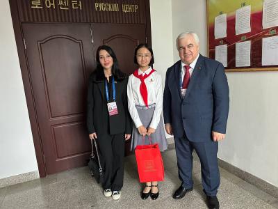 В ходе визита в Пхеньянский институт иностранных языков делегация встретилась с учениками функционирующего на базе Института Русского центра, который был открыт Фондом «Русский мир» в 2009 году. КПРФ, межпарламентская Группа Дружбы с КНДР совместно с Посольством России в КНДР активно сотрудничает с ПУИЯ по вопросу продвижения русского языка в Корее. В рамках этой работы, в июне 2025 года по приглашению лидера КПРФ и СКП-КПСС Г.А. Зюганова и первого заместителя Председателя ЦС СКП-КПСС К.К. Тайсаева в Москву с визитом прибыла делегация из Института для участия в церемонии награждения победителей Международного конкурса по русскому языку «Расскажи миру о своей Родине». В конкурсе приняла участие ученица Хван Да Ми – она была среди тех ребят, чей открытый урок делегация КПРФ посетила в ходе апрельского визита в КНДР. Визит делегации в Россию получил большой резонанс в Корее и дал мощный импульс популяризации русского языка среди корейской молодежи. Казбек Тайсаев тепло поприветствовал Хван Да Ми, передал ей сладкие подарки и пригласил ученицу Русского центра снова посетить нашу страну, но в этот раз – уже вместе со своими одноклассниками – и подчеркнул, что в дальнейшем планируется расширение практики приглашения в Россию особо отличившихся в учебе корейских студентов, изучающих русский язык.