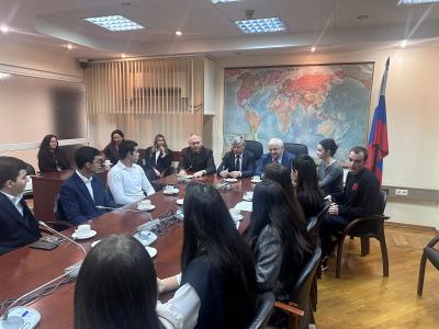 В зале Комитета по делам СНГ состоялась встреча Председателя Комитета ГД по делам СНГ, евразийской интеграции и связям с соотечественниками, заместителя Председателя ЦК КПРФ Л.И. Калашникова, Первого заместителя председателя Комитета ГД по международным делам, заместителя Председателя ЦК КПРФ Д.Г. Новиковаи Первого заместителя председателя Комитета ГД по делам СНГ, евразийской интеграции и связям с соотечественниками, Первого заместителя Председателя ЦС СКП–КПСС К.К. Тайсаева со студентами Ташкентского филиала МГИМО МИД России, проходящими обучение в России в рамках академического обмена.