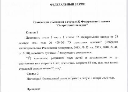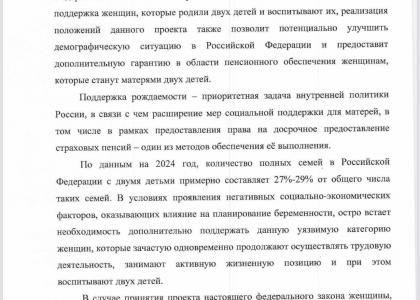 Документ предлагает дополнить пункт 1 части 1 статьи 32 федерального закона «О страховых пенсиях» новой нормой, согласно которой матери двух детей, воспитавшие их до достижения ими восьмилетнего возраста, смогут оформлять страховую пенсию досрочно — с 58 лет, при наличии не менее 20 лет страхового стажа.