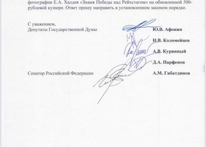 Группа депутатов Государственной Думы от КПРФ во главе с первым заместителем Председателя ЦК КПРФ Юрием Афониным направила запрос на имя председателя Банка России Эльвире Набиуллиной с предложением разместить на 500-рублевой купюре изображение легендарной фотографии Евгения Халдея «Знамя Победы над Рейхстагом».