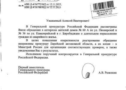 Парламентарий также добавил, что вопрос о судьбе аварийных домов по ул. Пионерской, 60 А и Кавалерийской, 36 в биробиджанской приёмной КПРФ находится на постоянном контроле. Согласно промежуточному ответу от 29 ноября, Генеральная прокуратура направила обращения по этим домам в прокуратуру Еврейской автономной области и Минстрой России для организации соответствующих проверок.