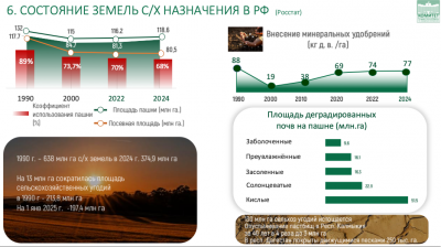 Площадь сельскохозяйственных угодий сократилась почти на 13 млн. га. И при всем этом по посевным площадям мы продолжаем толкаться на уровне 80 млн. га. Совсем недавно 117 миллионов гектар было.