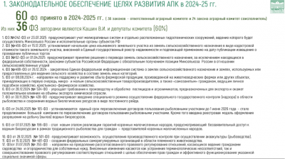 За последние два года в аграрной сфере Думой было принято более 60 федеральных законов, из них 36 — при непосредственном участии и ответственности аграрного комитета, ещё 24 — при его соисполнительстве. При этом 60% всех принятых законов были подготовлены при авторстве председателя Комитета и депутатов аграрного комитета, что говорит о системной и целенаправленной законодательной работе .