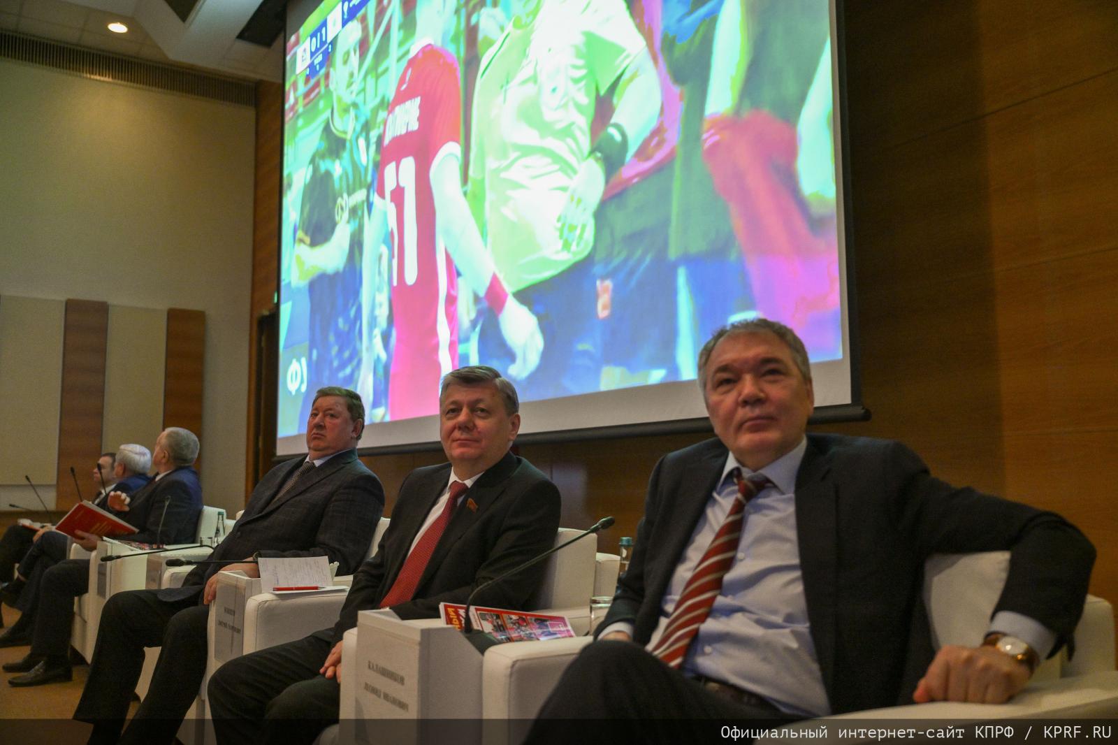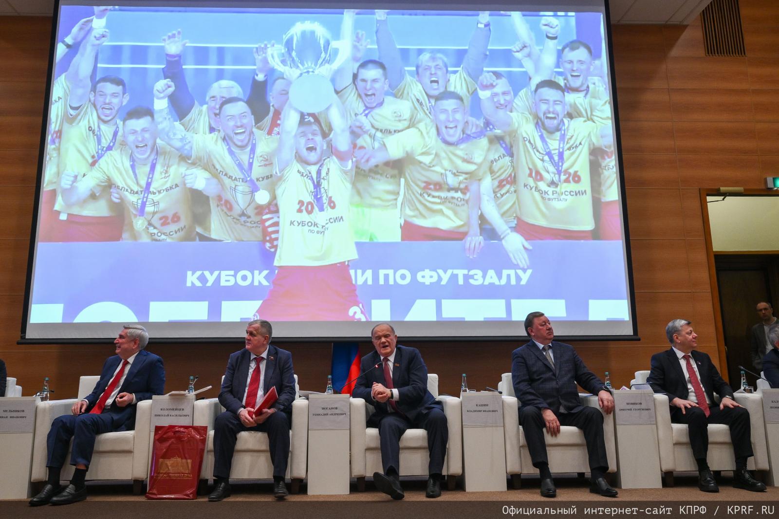 Накануне команда КПРФ во второй раз стала обладателем Кубка России по футзалу. Финальный матч состоялся в Сургуте, где наши спортсмены обыграли «Норильский Никель». На большом экране были продемонстрированы документальные кадры с этого матча, Г.А. Зюганов и депутаты нашей фракции поздравили футболистов с выдающейся спортивной победой.