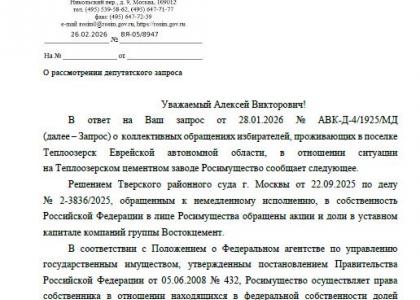В Росимуществе пояснили, что сейчас управление заводом осуществляется в соответствии с позицией Минобороны России. Именно это ведомство предложило кандидатуру нового руководителя ООО «Востокцемент» Бориса Зимина. При этом само Росимущество пока не сформировало окончательную позицию по всем вопросам, поднятым в депутатском запросе, и ожидает реакции от военного ведомства.