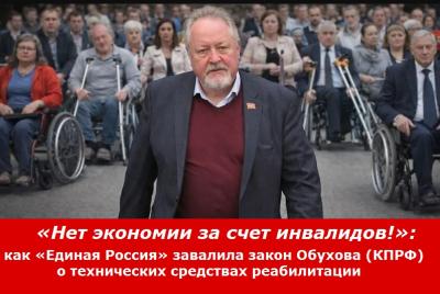 КПРФ настаивала на жестких гарантиях обеспечения техническими средствами реабилитации, «Единая Россия» спряталась за формальными отговорками. «Не трогайте расходы на инвалидов!» — вот суть спора КПРФ и «Единой России» в Госдуме. Депутаты-коммунисты С.П.Обухов и А.В.Куринный потребовали законодательно защитить расходы на коляски и протезы, профильный комитет и единороссы отказались даже допустить закон до второго чтения.